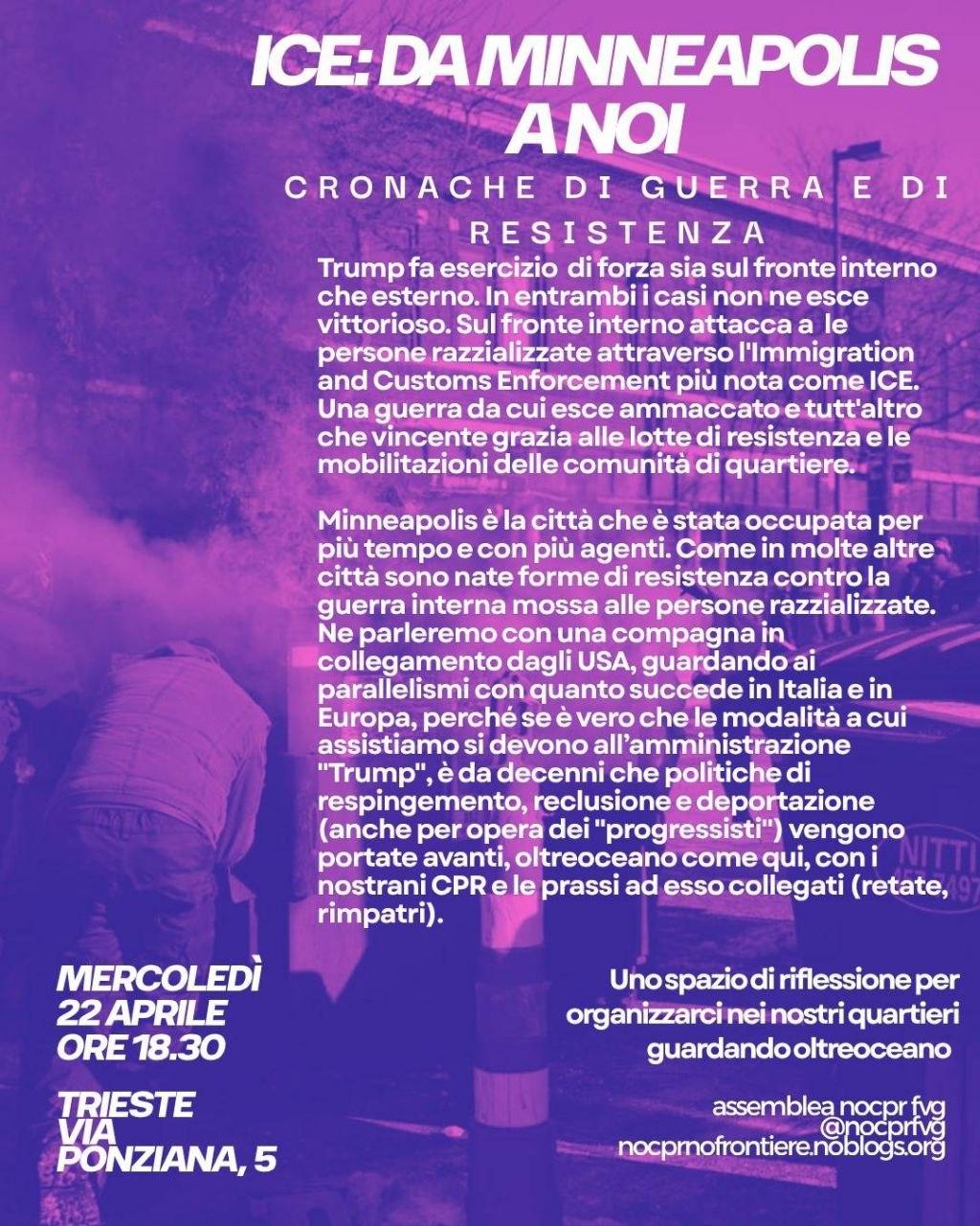 Guardiamo invece con entusiasmo e interesse le lotte di resistenza e rivolta organizzata in modo orizzontale e dal basso. Dove al centro c’è un’etica di difesa partecipativa della comunità. Ne parleremo con una compagna che vive a quelle latitudini, che ci racconterà e ci aiuterà a leggere le lotte di Minneapolis, nell’ottica di trovare spunti di riflessione per rispondere a ciò che sta accadendo alle nostre latitudini.